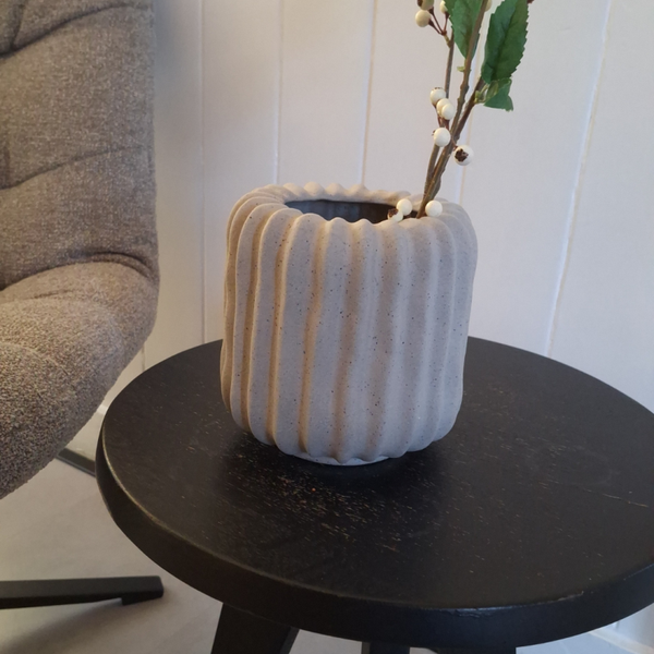 Keramische grijze bloempot met lichte spikkels. Met de organische vormen van de bloempot wordt het een eyecatcher in jouw scandinavische interieur.